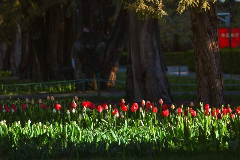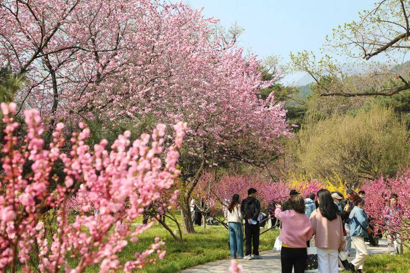 历经春风滋养、春雨润泽,国家植物园(北园)早已被烂漫春色晕染成绚丽画卷,满园繁花次第绽放、生机盎然,成为京城游客踏青赏花、邂逅春日诗意的绝佳目的地。步入园区桃花大道,春日的热烈与柔美在此交融共生。国家植物园(北园)拥有自主知识产权的‘品虹’桃和‘品霞’桃在这里迎风盛放,粉艳的花团缀满枝头,与高大素白的‘白花山碧桃’相间而生,万千繁花层层叠叠铺满枝头,深浅相映、美不胜收,更有明亮鲜艳的郁金香点缀其间,辅以远处的层峦叠起的青山,勾勒出一幅芳菲四溢的春日盛景,让每一位游人沉醉其中,流连忘返。
