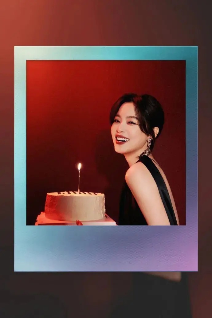 辛芷蕾穿着无袖的黑色长裙,她手捧蛋糕绽放灿烂笑容,元气满满,心情大好。